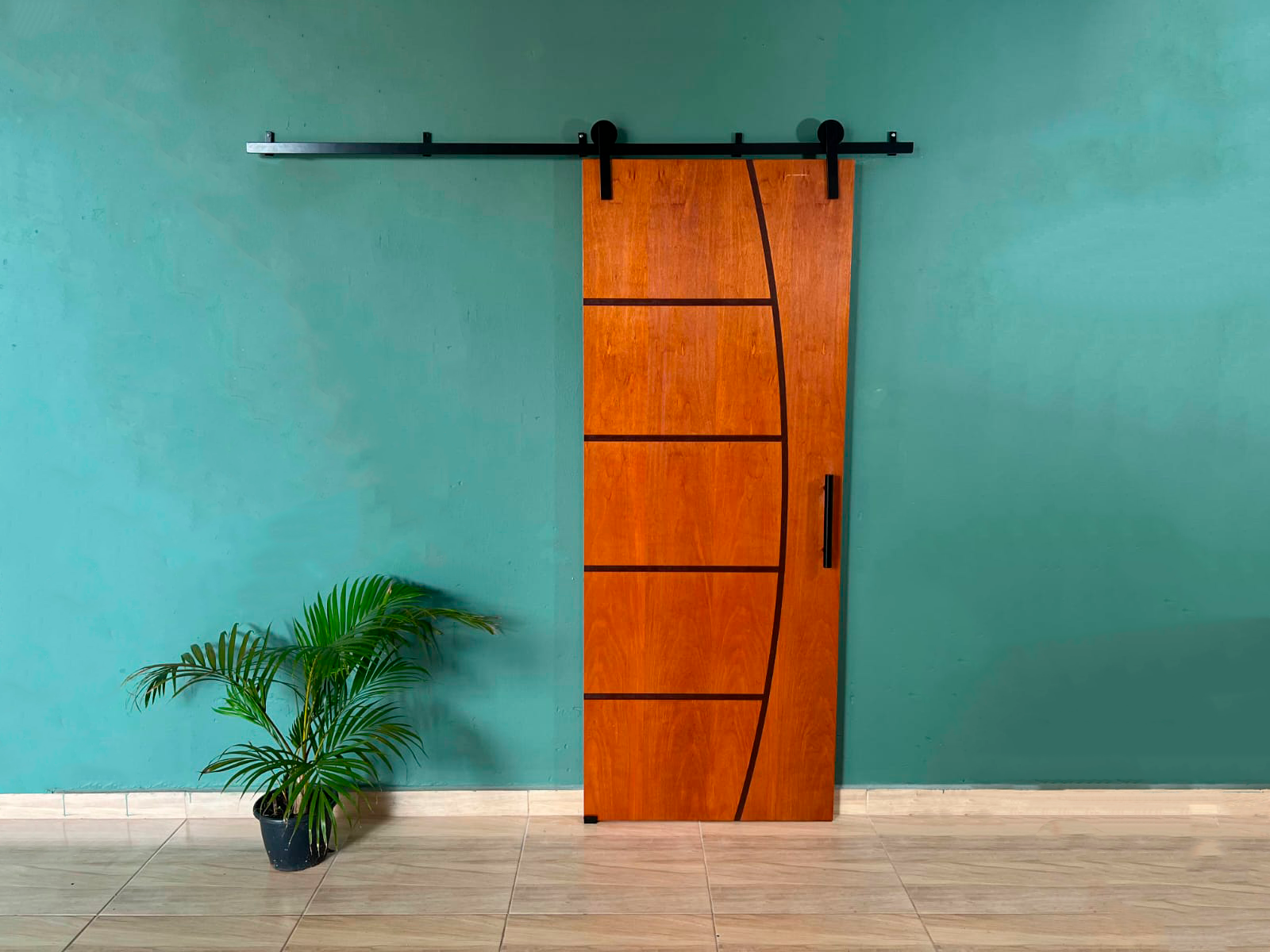 Kit porta de correr em MDF na opção verde. Acompanha trilho aparente de alumínio com roldanas aparentes, puxador e pino guia (não incluso fechadura). Porta de correr ideal para divisórias de ambiente.